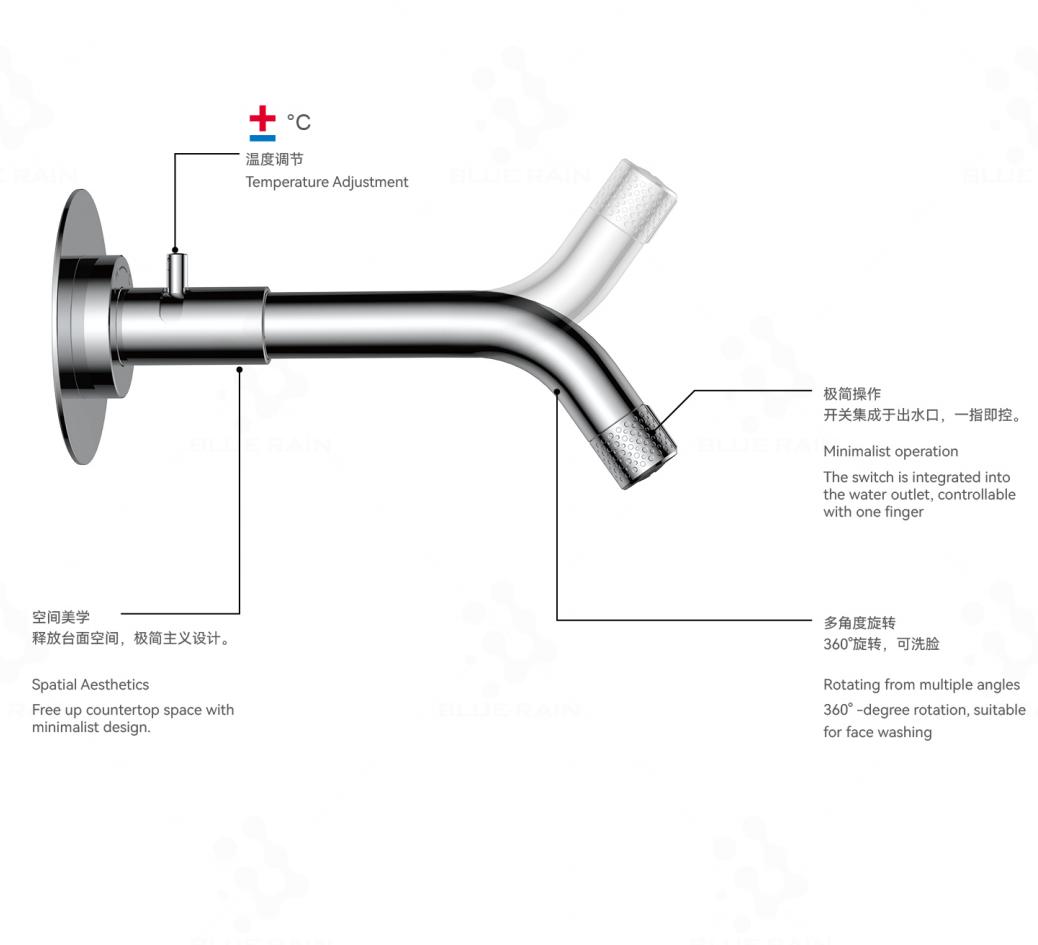 同时,关闭传统龙头后,滞留在“出水口”与“开关阀”之间管道内的水,会因重力自然滴落,形成令人不悦的残留水滴,既浪费水资源,也容易在水槽边沿形成水渍和污垢。我们的设计正源于对这一系列细微但持久痛点的洞察:为什么开关不能就在水流的终点?我们将机械开关模块高度集成于龙头的出水端口,实现了“指哪打哪”的直觉式操控,从根本上革新了人与水龙头的交互方式。
