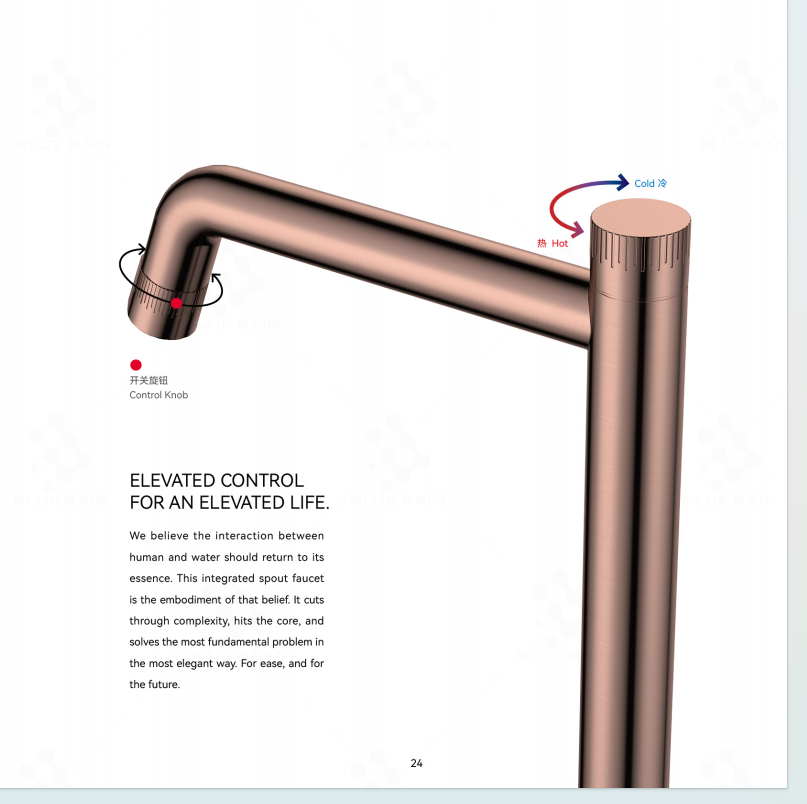 同时,关闭传统龙头后,滞留在“出水口”与“开关阀”之间管道内的水,会因重力自然滴落,形成令人不悦的残留水滴,既浪费水资源,也容易在水槽边沿形成水渍和污垢。我们的设计正源于对这一系列细微但持久痛点的洞察:为什么开关不能就在水流的终点?我们将机械开关模块高度集成于龙头的出水端口,实现了“指哪打哪”的直觉式操控,从根本上革新了人与水龙头的交互方式。