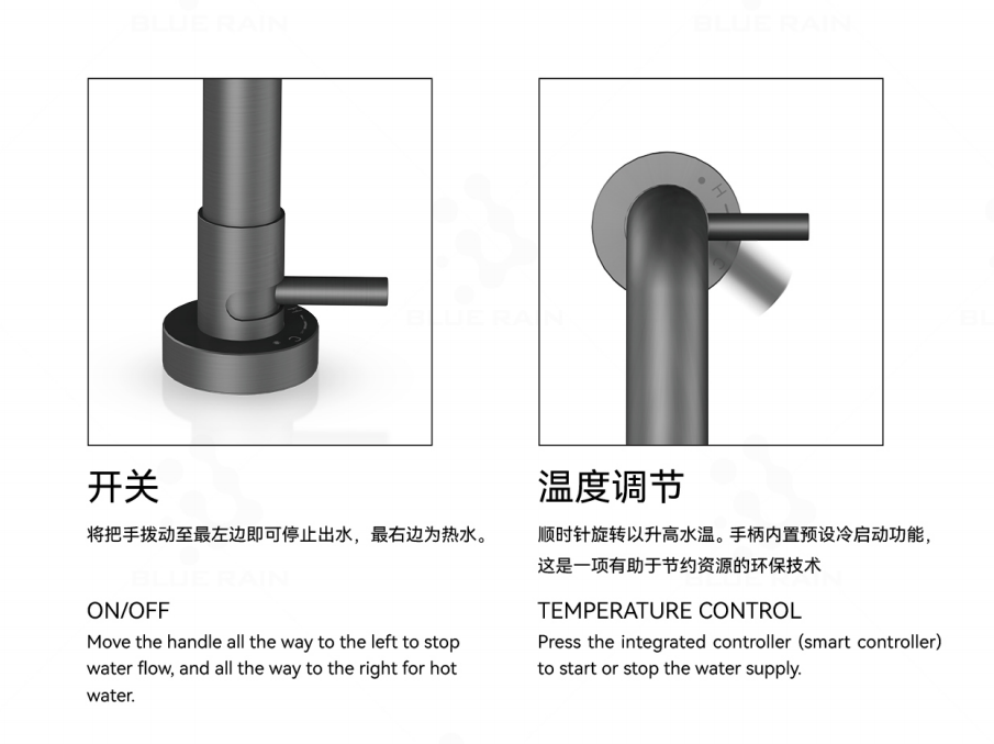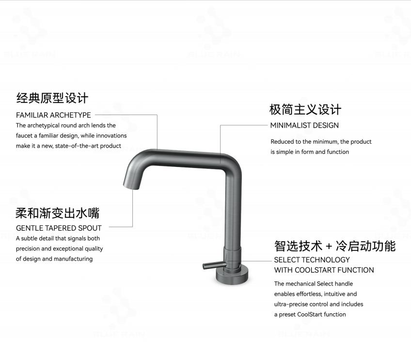 同时,关闭传统龙头后,滞留在“出水口”与“开关阀”之间管道内的水,会因重力自然滴落,形成令人不悦的残留水滴,既浪费水资源,也容易在水槽边沿形成水渍和污垢。我们的设计正源于对这一系列细微但持久痛点的洞察:为什么开关不能就在水流的终点?我们将机械开关模块高度集成于龙头的出水端口,实现了“指哪打哪”的直觉式操控,从根本上革新了人与水龙头的交互方式。