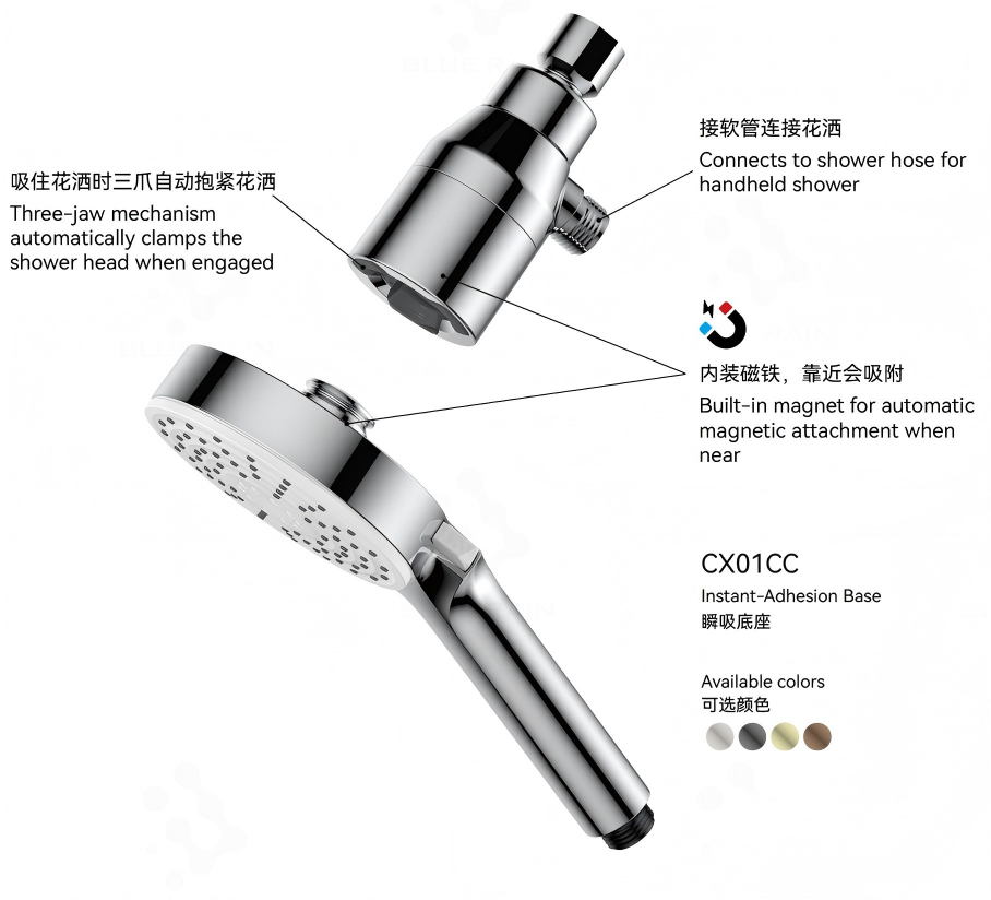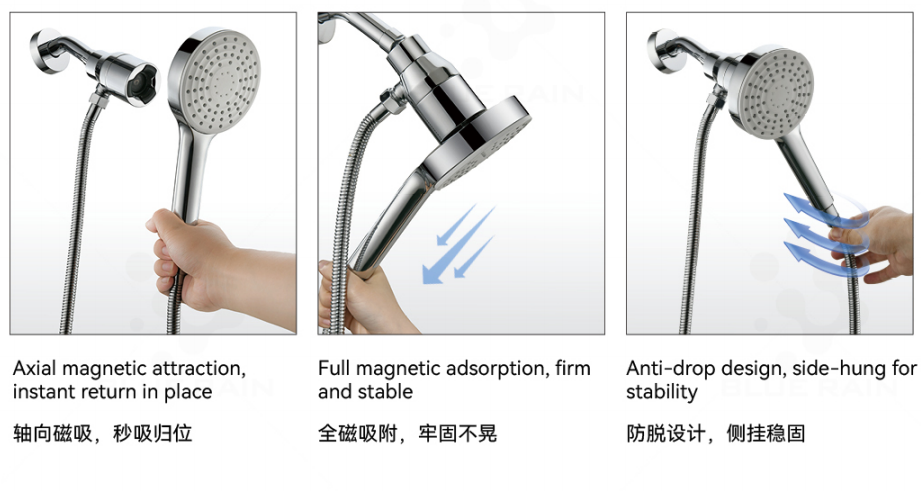 真正的直觉交互:实现了“盲操”和“靠近即得”,将放置花洒这一动作简化到极致。极致的可靠性:以工程级的磁力计算取代脆弱的机械卡扣,耐用性极大提升,无塑料卡钩磨损、断裂之忧。